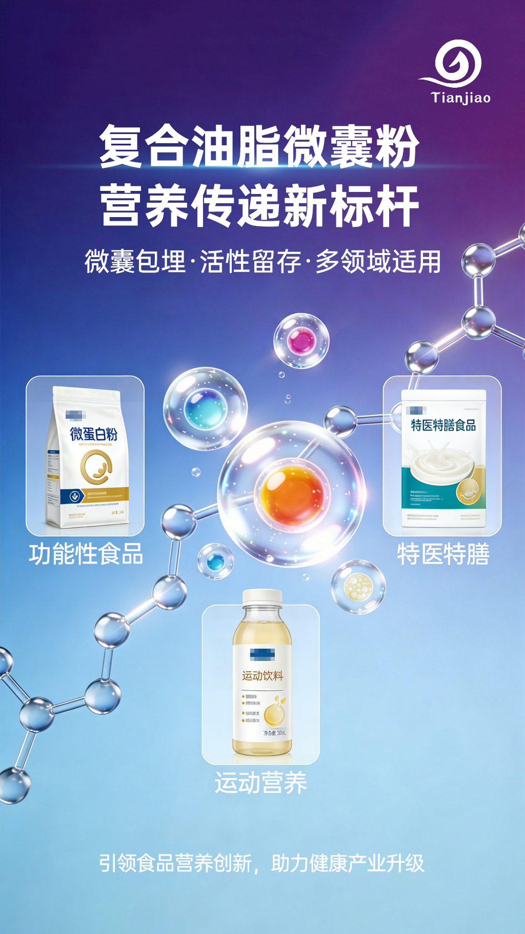复合油脂微囊粉是以多种功能油脂(如DAG油、MCT油、ω-3油、植物油)按科学配比为原料,通过微胶囊包埋+喷雾干燥技术制成的高稳定性功能粉末油脂原料。特点在于:集合多种功能油脂优点,兼具控脂、供能、心脑血管、抗氧化等多重功能于一体。本质定位:“多功能油脂粉末化解决方案,可按配方目标定制复合功能属性。”